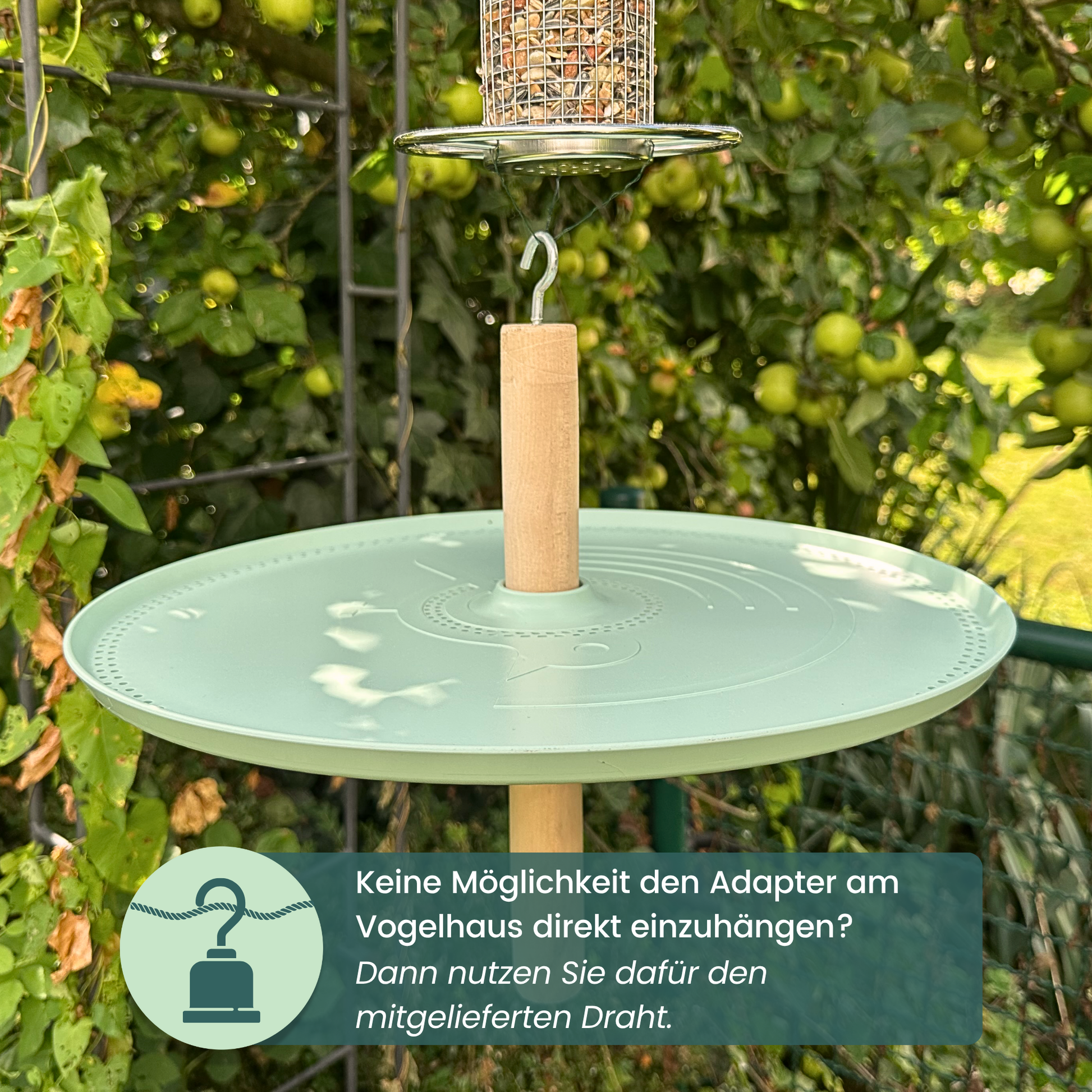 Der Adapter wird einfach zwischen der Aufhängung und dem Vogelhaus angebracht.